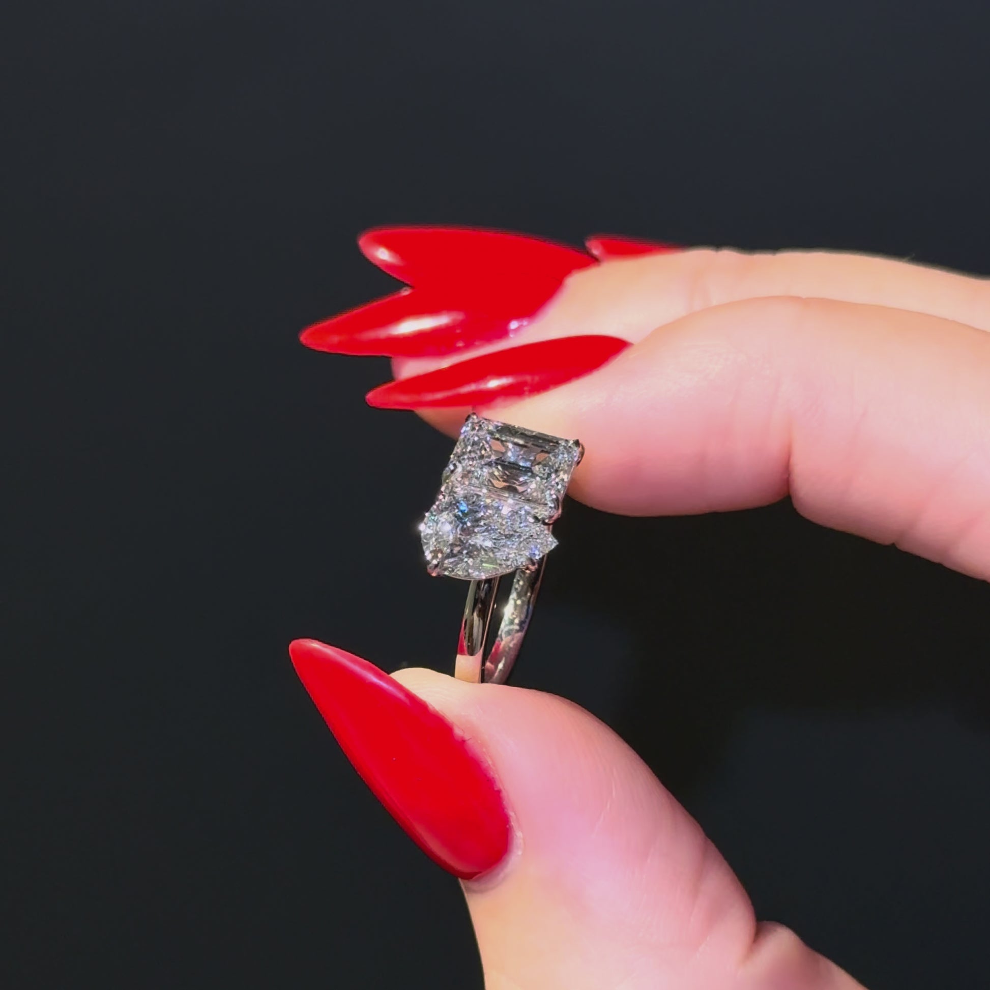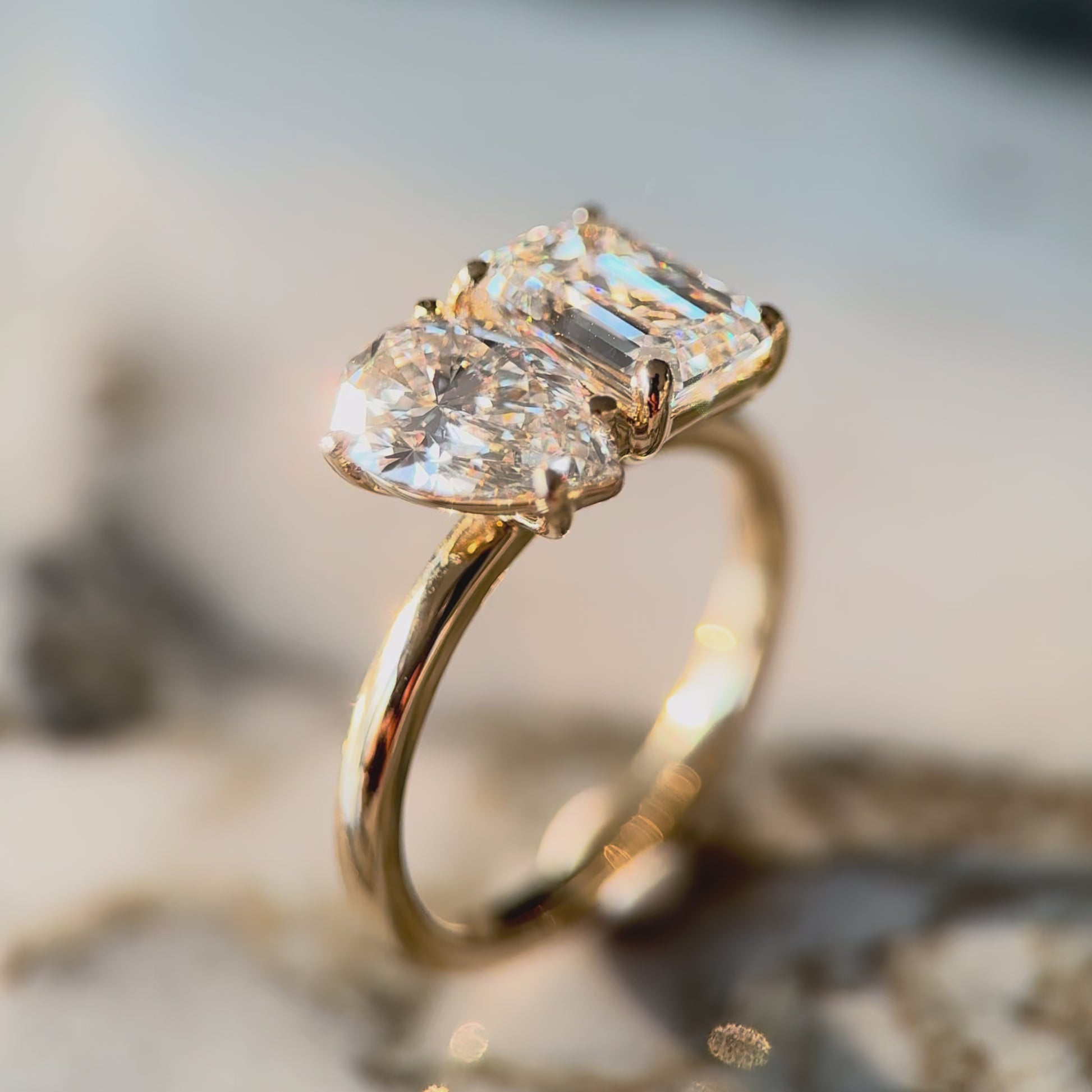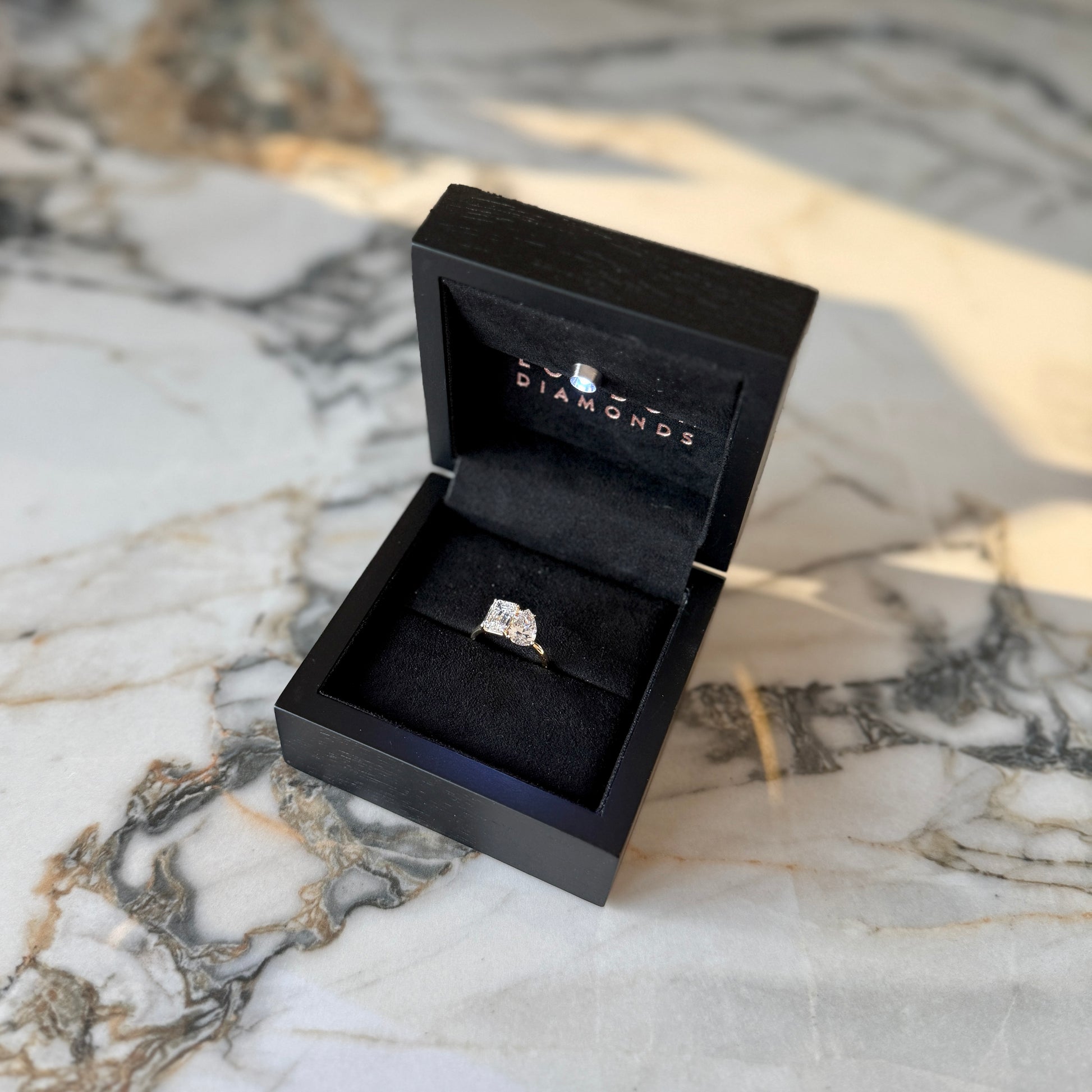Featuring a pear cut diamond of 1ct+ and an emerald cut of at least 1.50ct and certified as D or E colour and VVS clarity but more importantly, just like our bespoke rings, we choose each diamond for maximum sparkle and fire with the optimum dimensions.